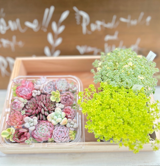 エケベリア寄せ植えセット パックの内容 ・エケベリア小苗(名無し) (大きめ群生1苗と小苗10苗) ・スキマ用苗 セダムなど ・セダム2ポット(ミルクゥージ・細葉黄金万年草) ・育成木箱(リメイク無し) 木箱サイズ 外寸 横280mm×縦195mm×高さ50mm 内寸 横250mm×縦182mm×深さ45mm ◻︎別途送料がかかります ※ご購入の前に【ご購入前のご案内】を、 ご一読頂けますよう、よろしくお願いします。 こちらは、 たまちゃんず倶楽部会員ではない 一般の方が購入できる商品です。 お間違いのないようお願い致します。 倶楽部会員さまは、 【会員限定】の商品より 購入して頂けると幸いです。